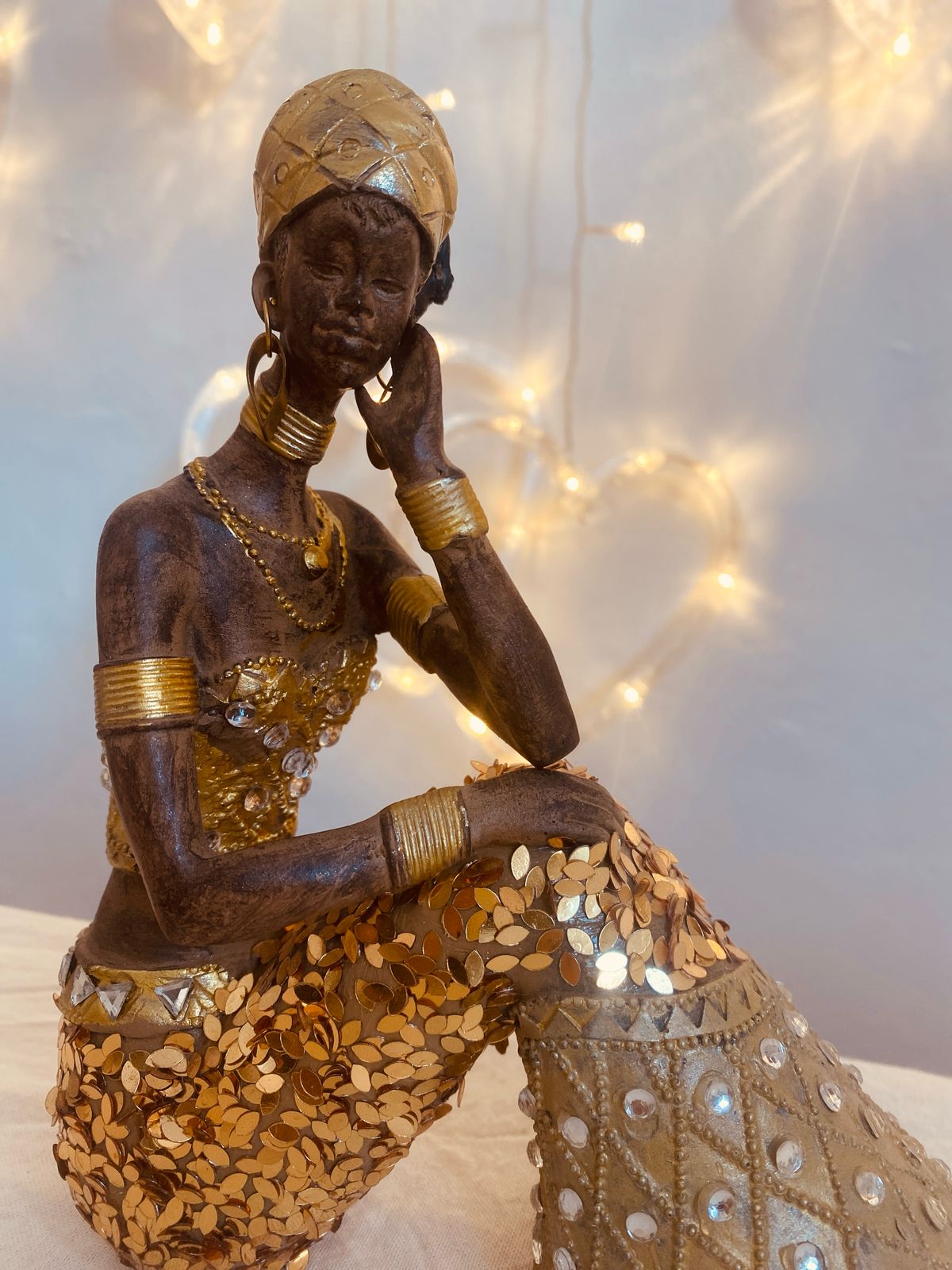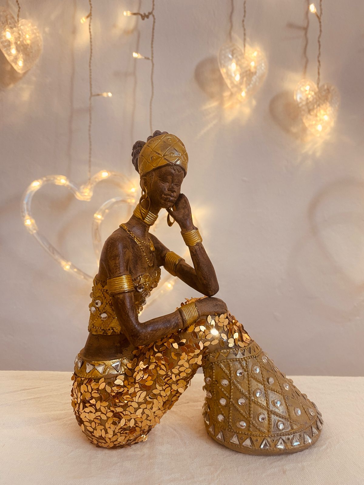 Descanso con estilo. Figura sentada con postura delicada, vestida en dorado con textura, strass y detalles que elevan cualquier rincón.