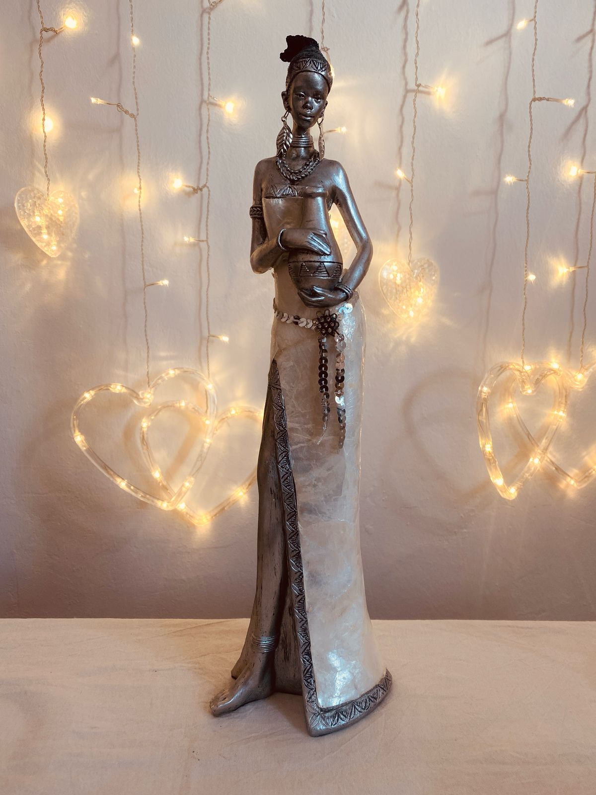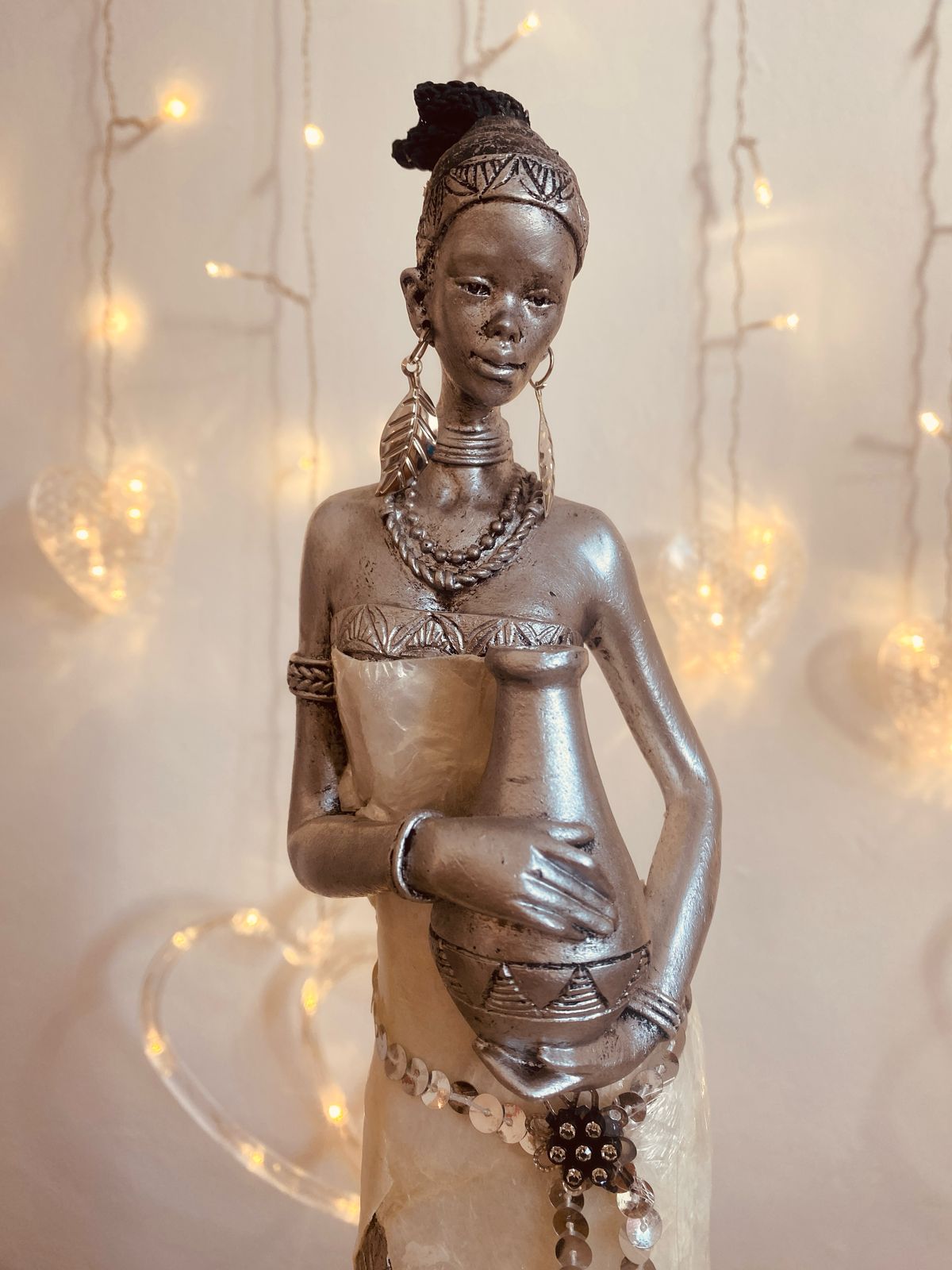 Imponente y refinada. Figura plateada alta, con vestido nacarado y detalles brillantes. Presencia única.