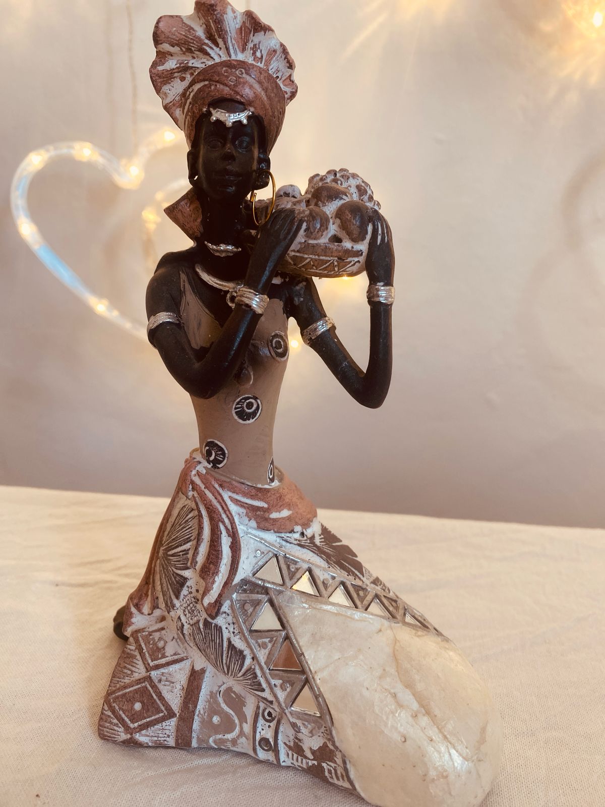 Escena de tradición y armonía. Figura arrodillada, con vestido en tonos tierra, detalles de nácar y una fuente con frutas al hombro.