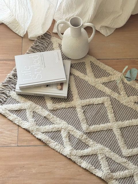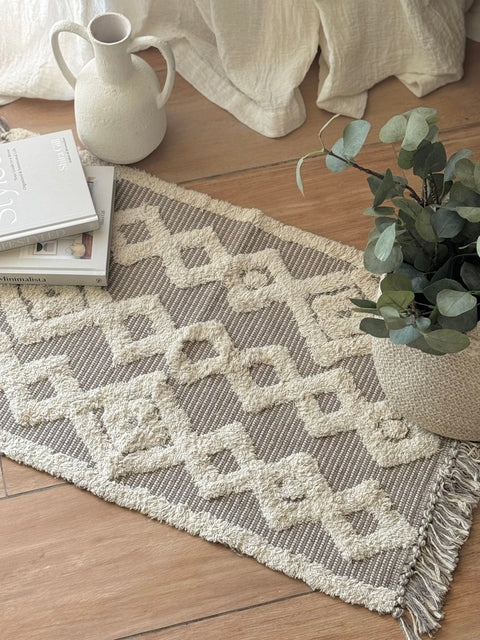 Estilo y calidez para tus espacios. Tejida en hilo con guardas y flecos, en tonos neutros que combinan con todo.