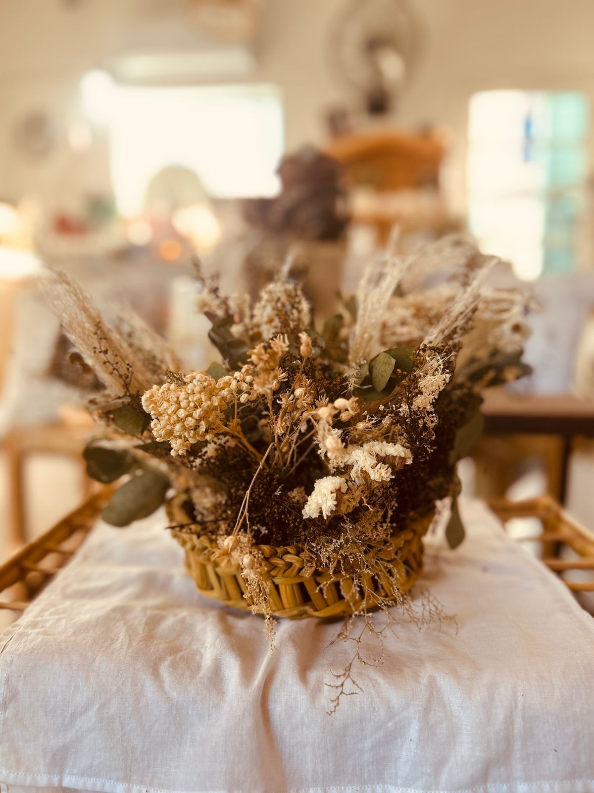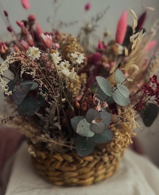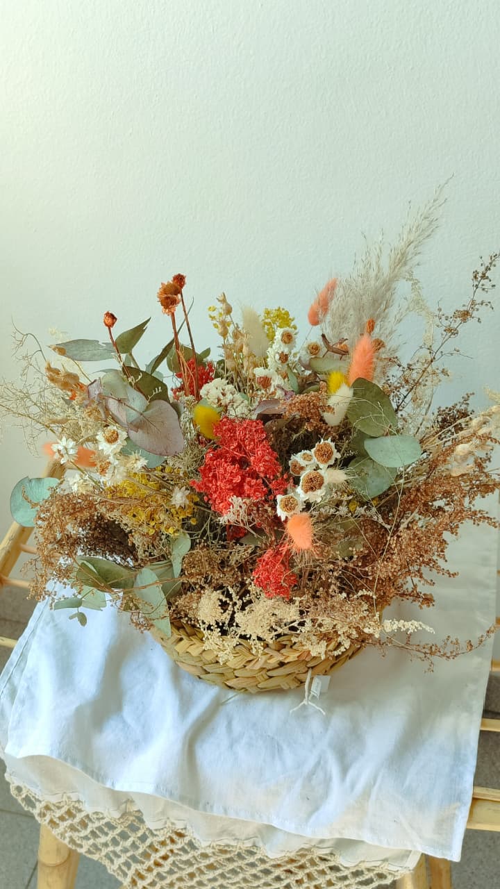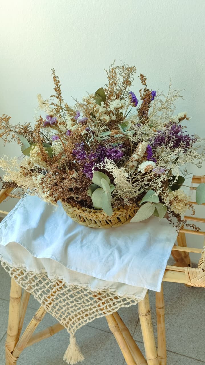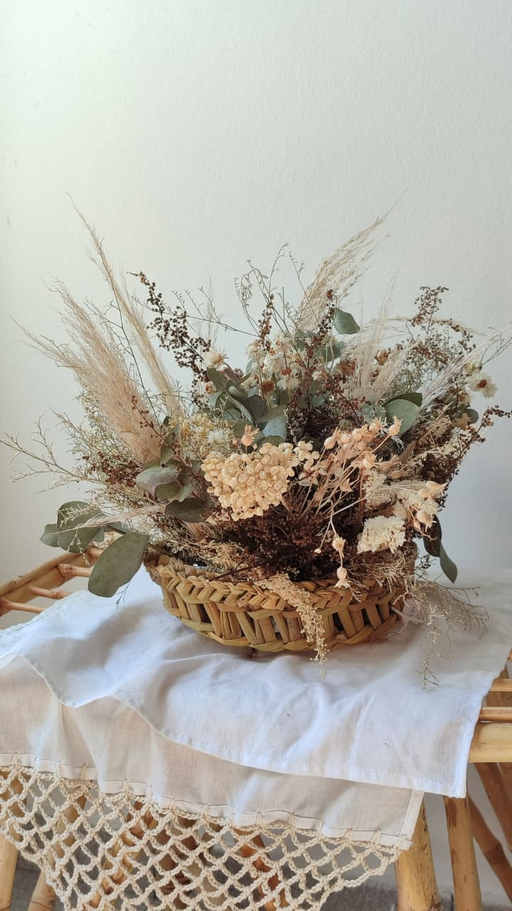 Ramos de flores preservadas en cesto de mimbre, ideal para dar un toque cálido y acogedor a tus espacios.