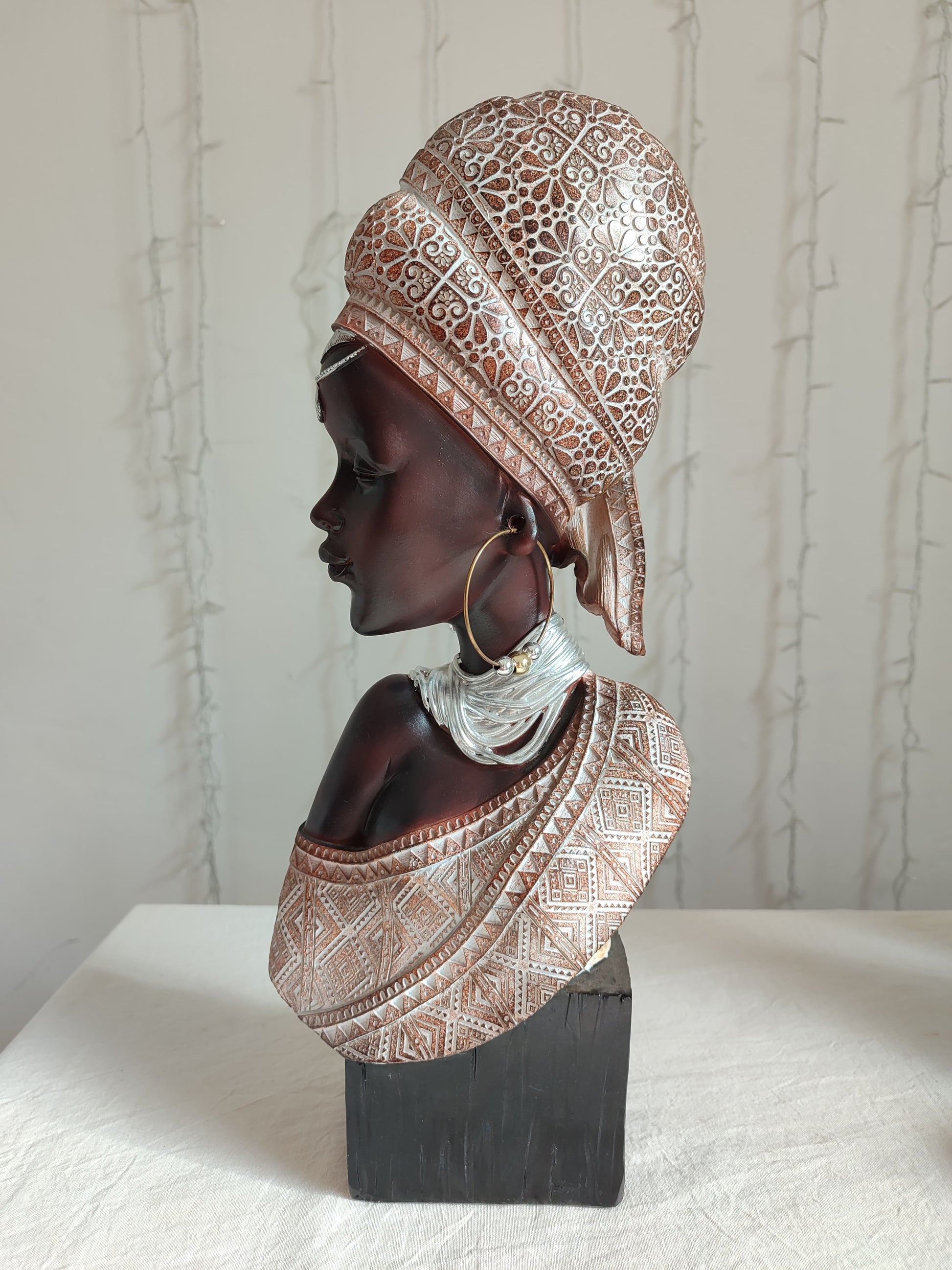 Una figura que irradia fuerza y belleza. Mujer africana de perfil. Su blusa se desliza sutilmente dejando ver un hombro, mientras las texturas y guardas en las telas suman carácter y elegancia artesanal. Una pieza con mucha presencia para destacar cualquier rincón.