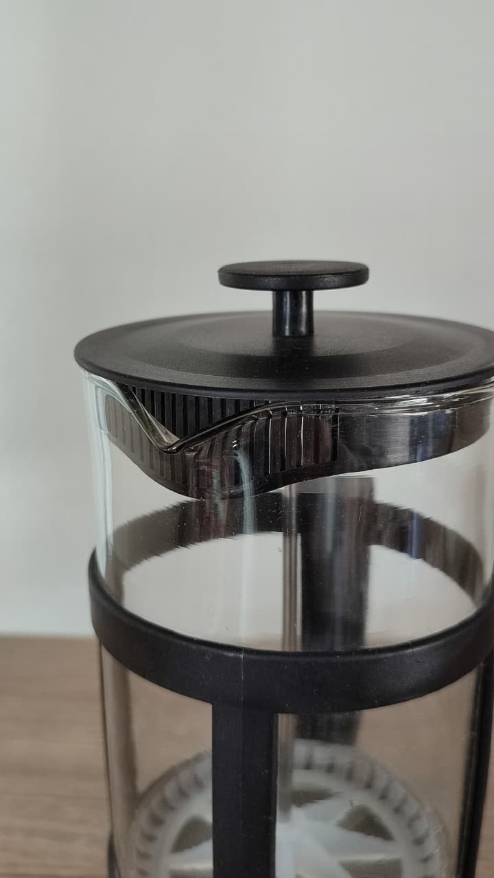 Cafetera tipo prensa francesa, con cuerpo de vidrio transparente y estructura en color negro. Permite preparar café de manera sencilla conservando todo el aroma y sabor. Ideal para los amantes del café que buscan un diseño práctico y moderno.