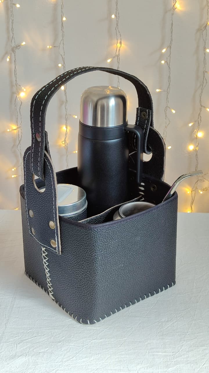 Práctico y moderno, con diseño en cuerina negra que combina estilo y funcionalidad para llevar tu equipo matero.