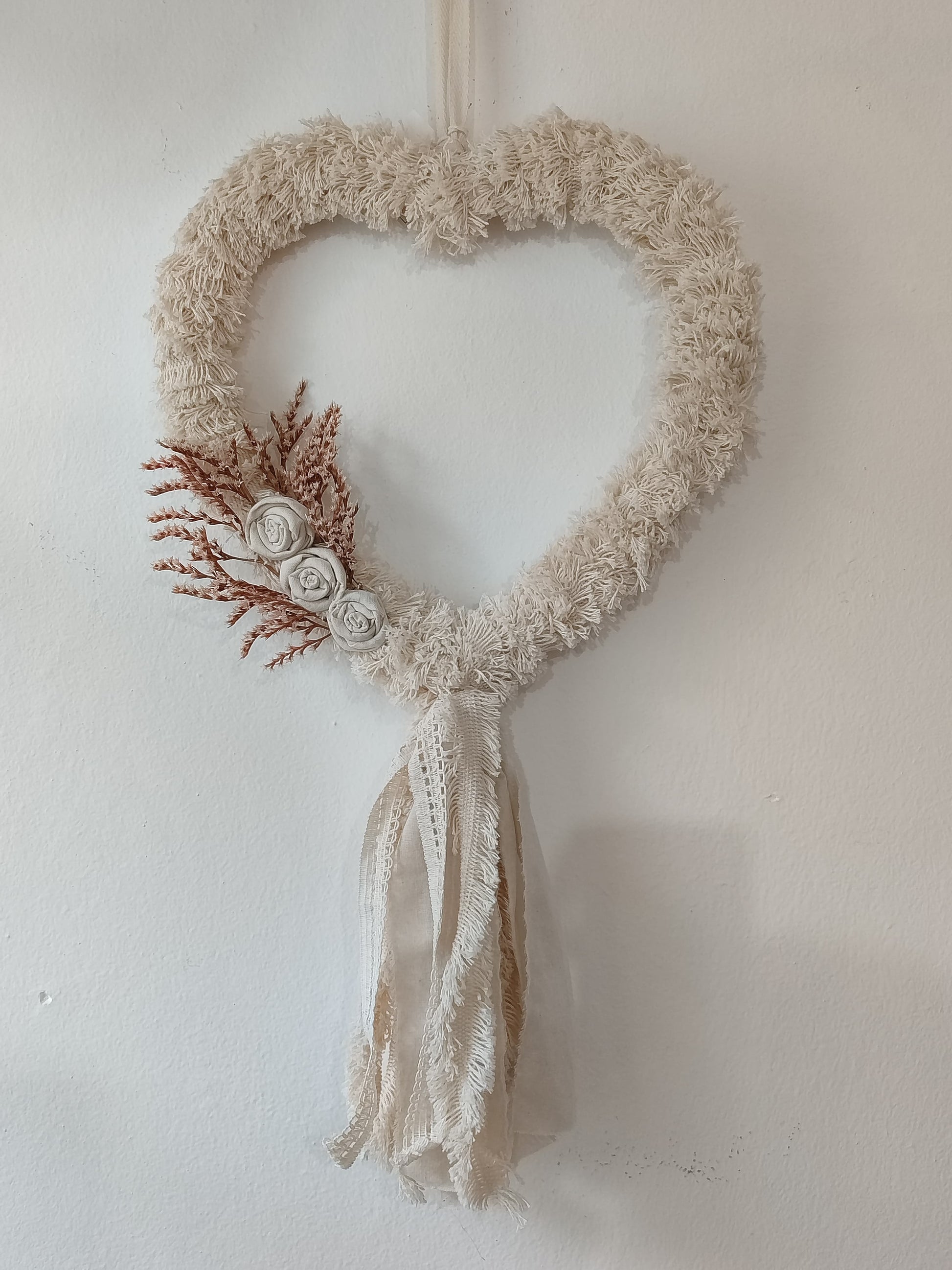 Bohemio y delicado. Marco de corazón con texturas suaves, flores secas y una borla artesanal hecha con telas naturales.