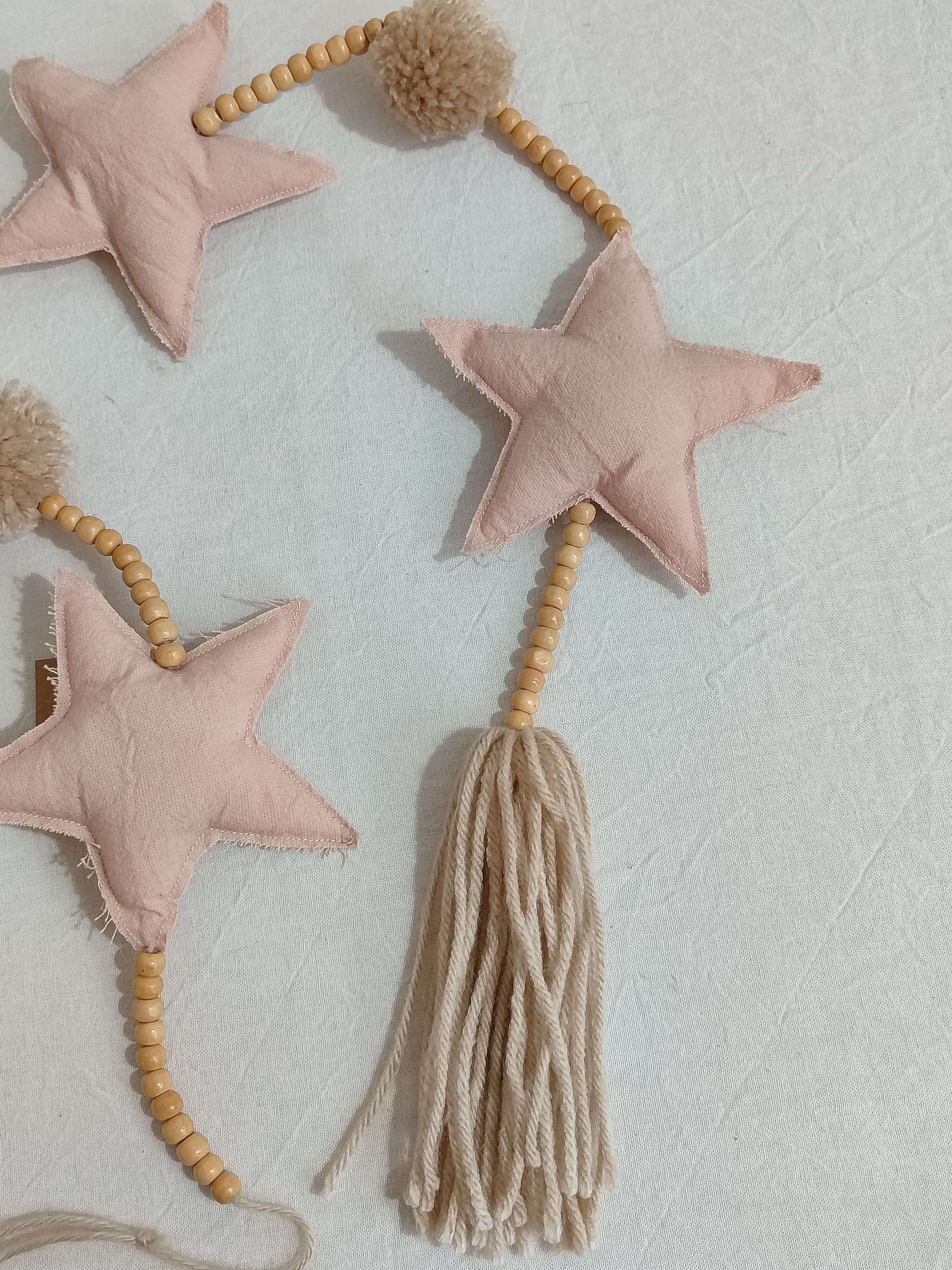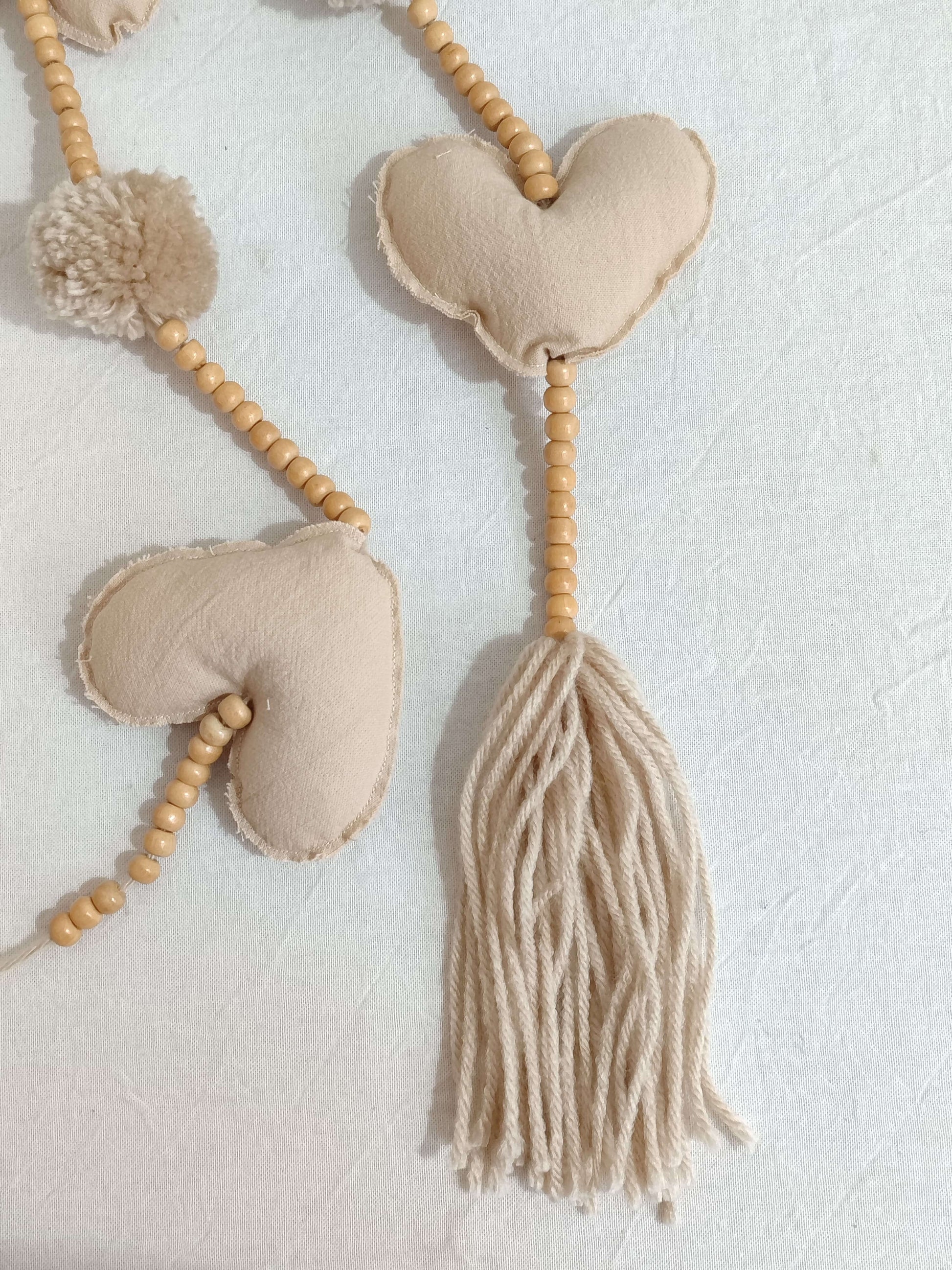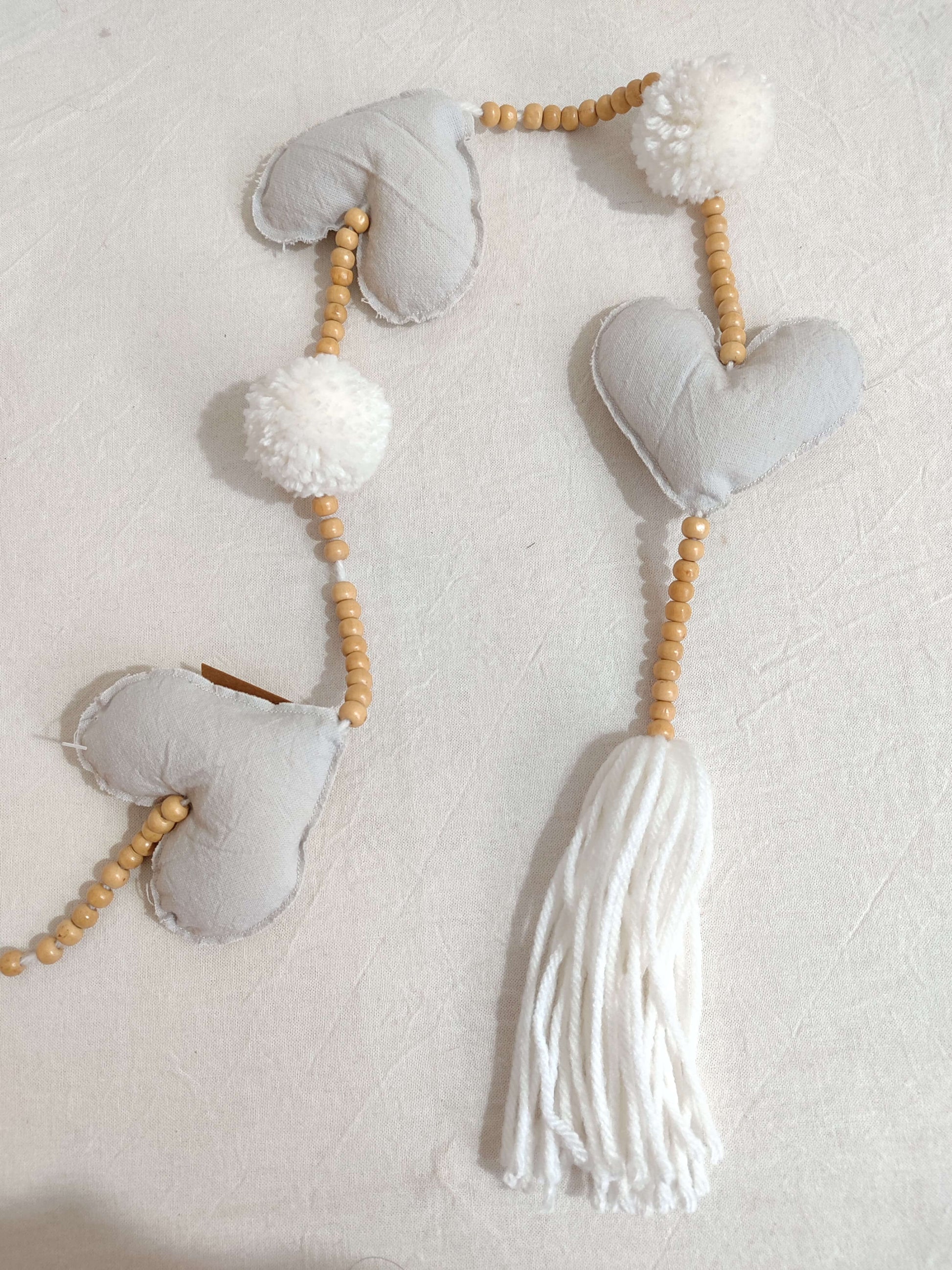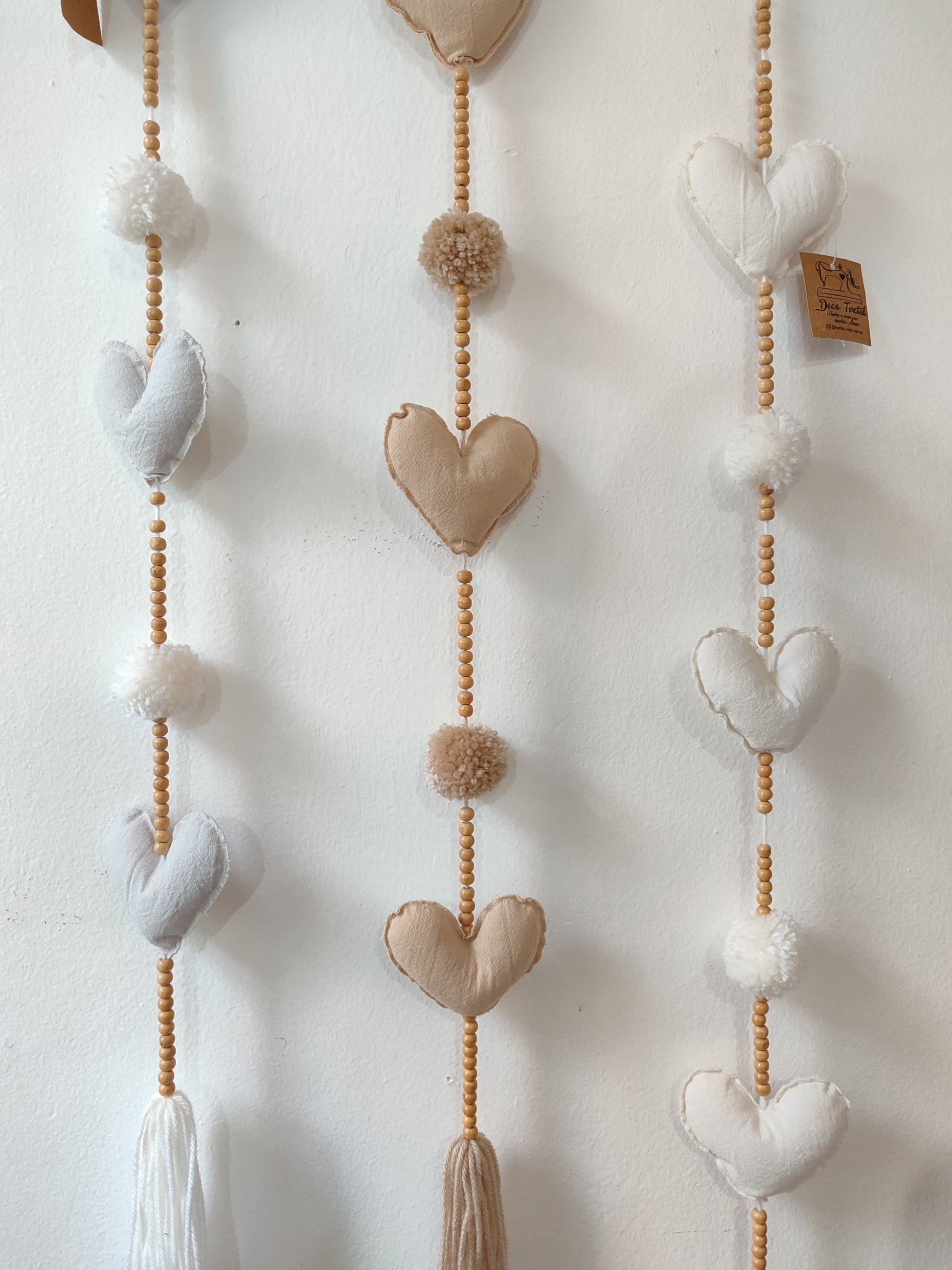 Dulzura en movimiento. Colgante de tela con formas, pompones y esferitas de madera que llenan de encanto cualquier espacio.