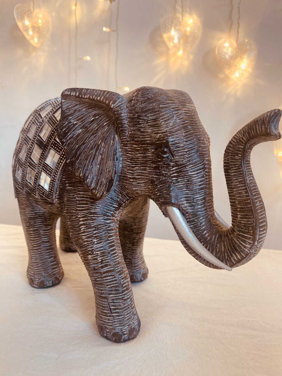 Con espíritu viajero y alma festiva, este elefante combina texturas y brillos en una manta que resalta sobre su cuerpo trabajado. Ideal para sumar un toque de encanto cultural.