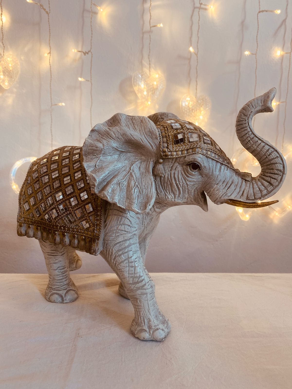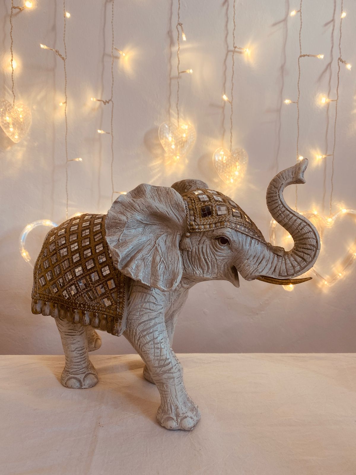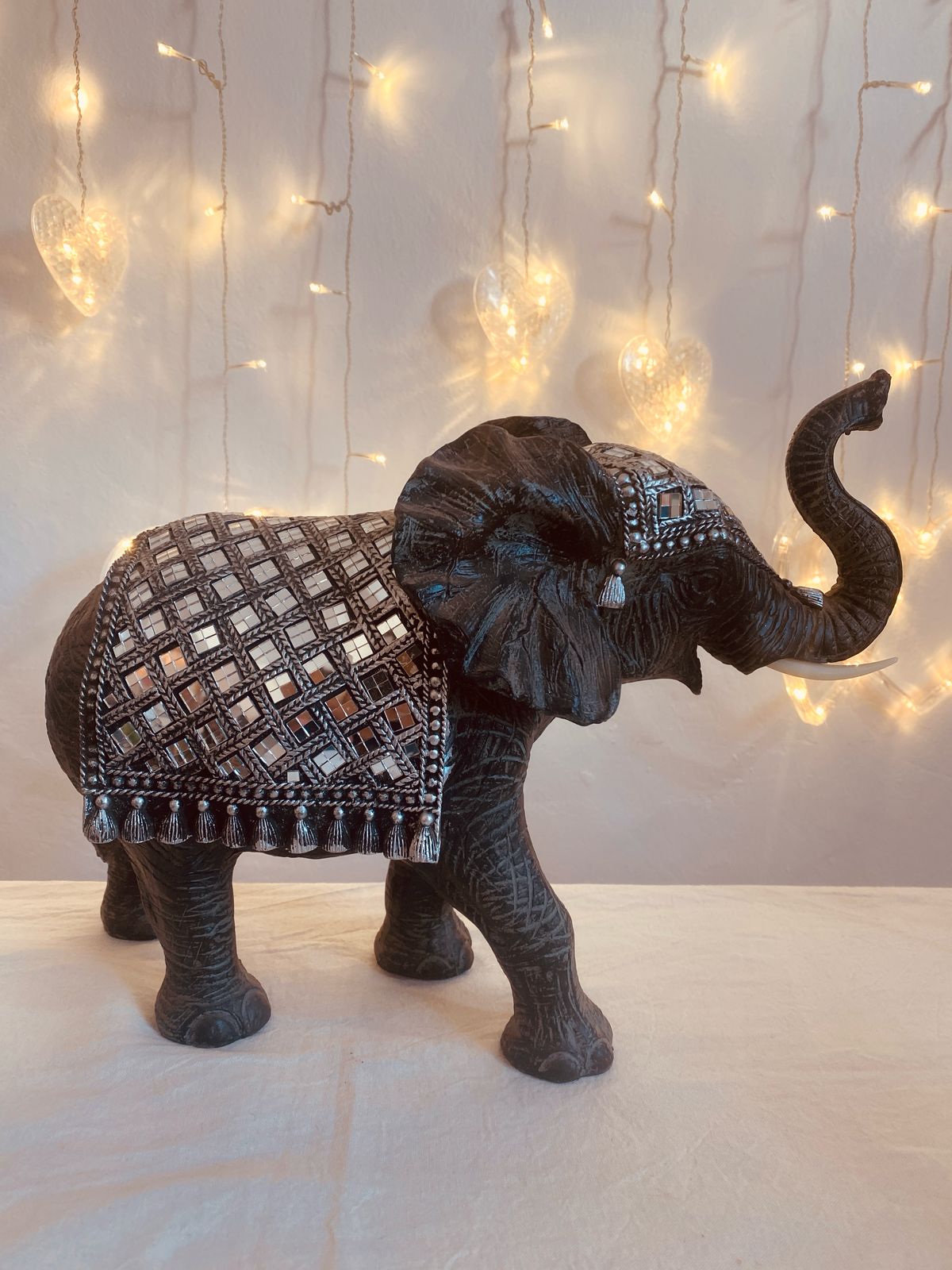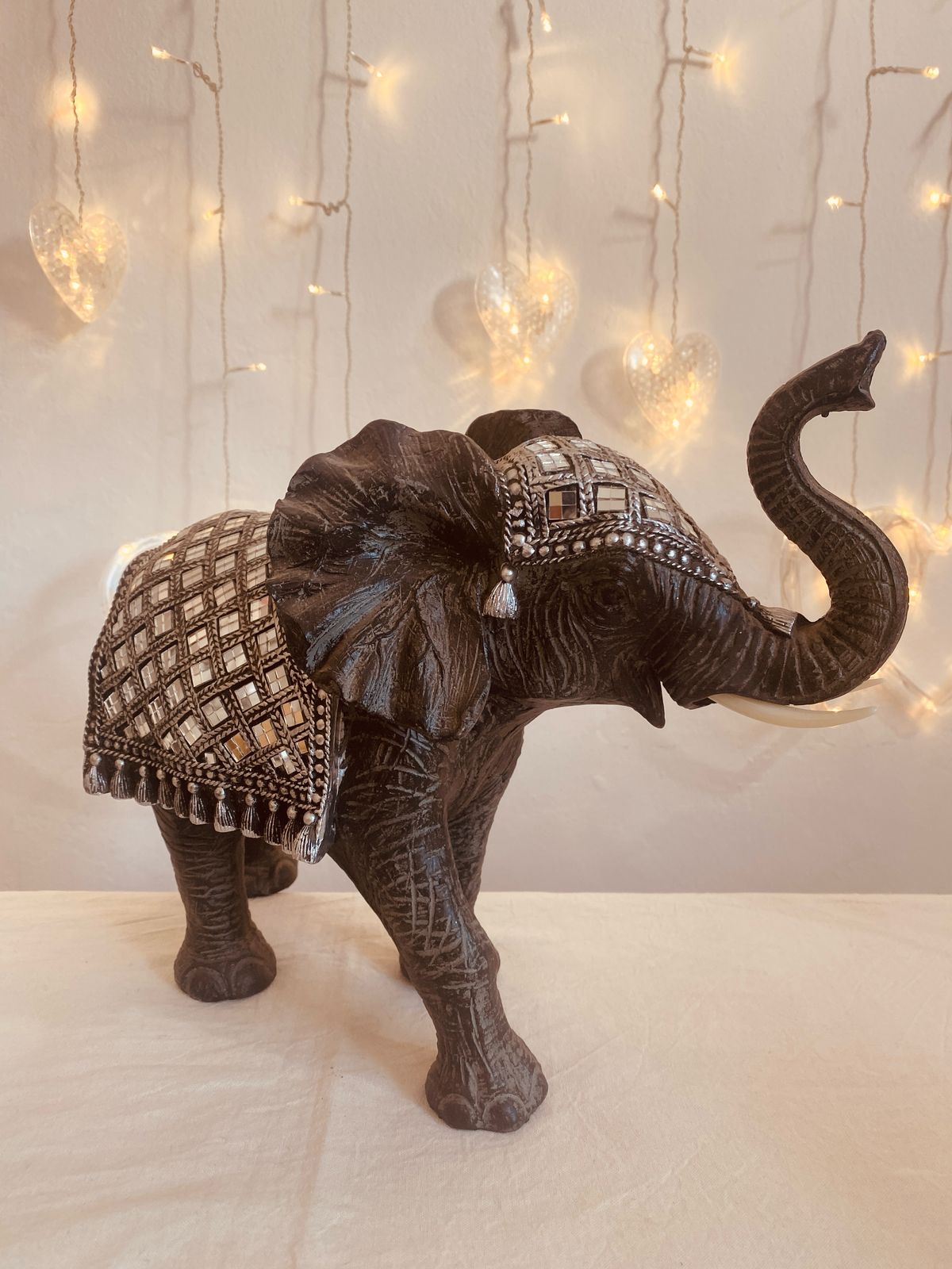 Una pieza majestuosa que evoca las ceremonias del oriente. Este elefante, con su manta ornamentada en tonos brillantes y detalles espejados, captura la esencia de lo exótico y lo noble.