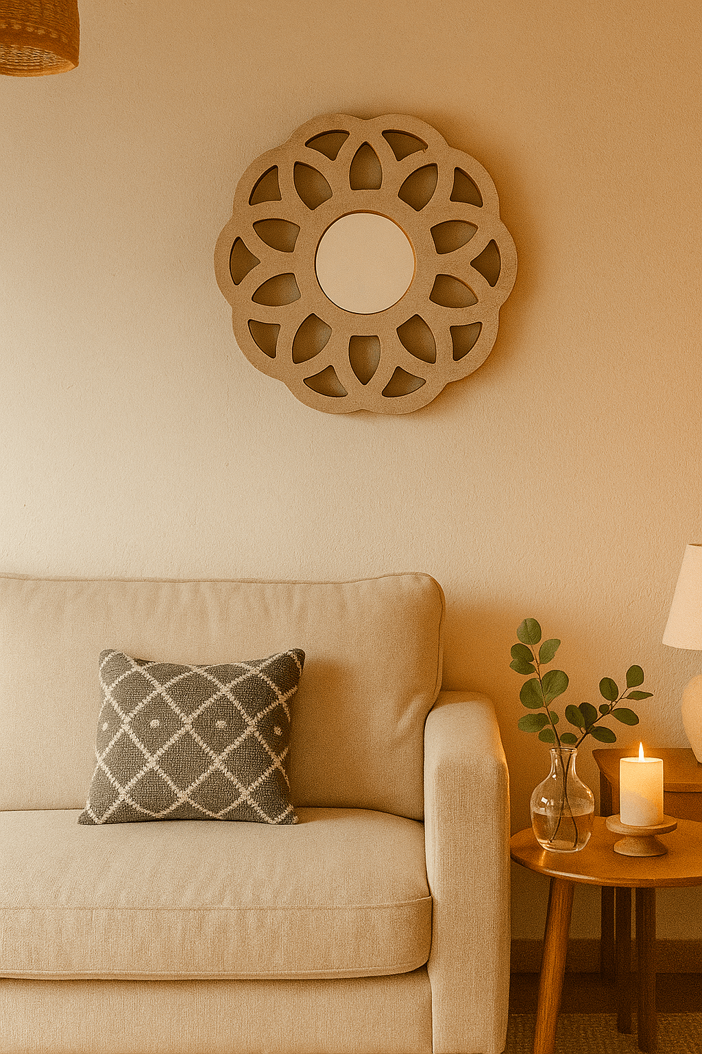 Un toque bohemio para tus rincones. Espejo pequeño en madera tallada con forma de mandala.