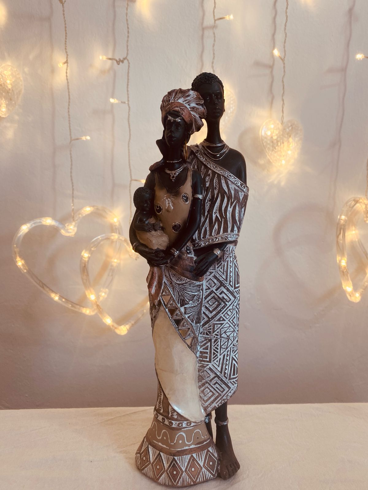 Un gesto de amor en forma de arte. Composición de tres figuras que transmiten calidez y conexión, con tonos tierra y texturas ricas en detalle.