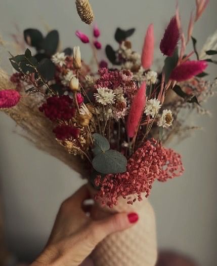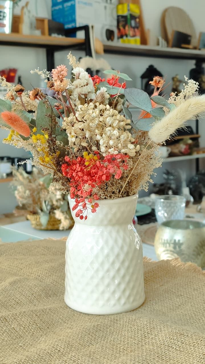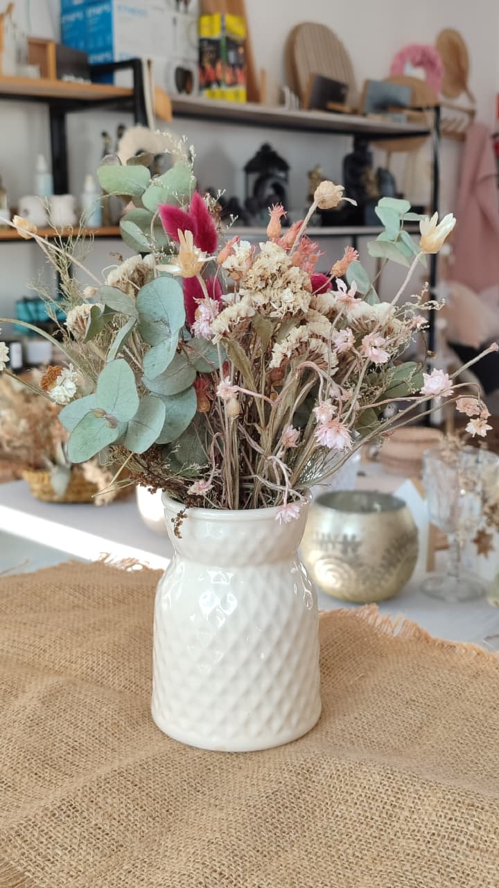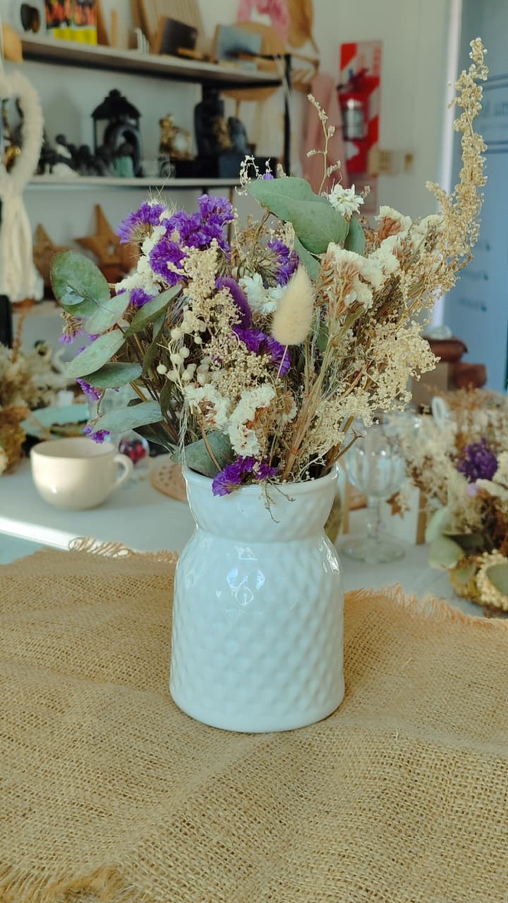 Florero de cerámica con ramo de flores preservadas. Una opción clásica, que nunca pasa de moda!