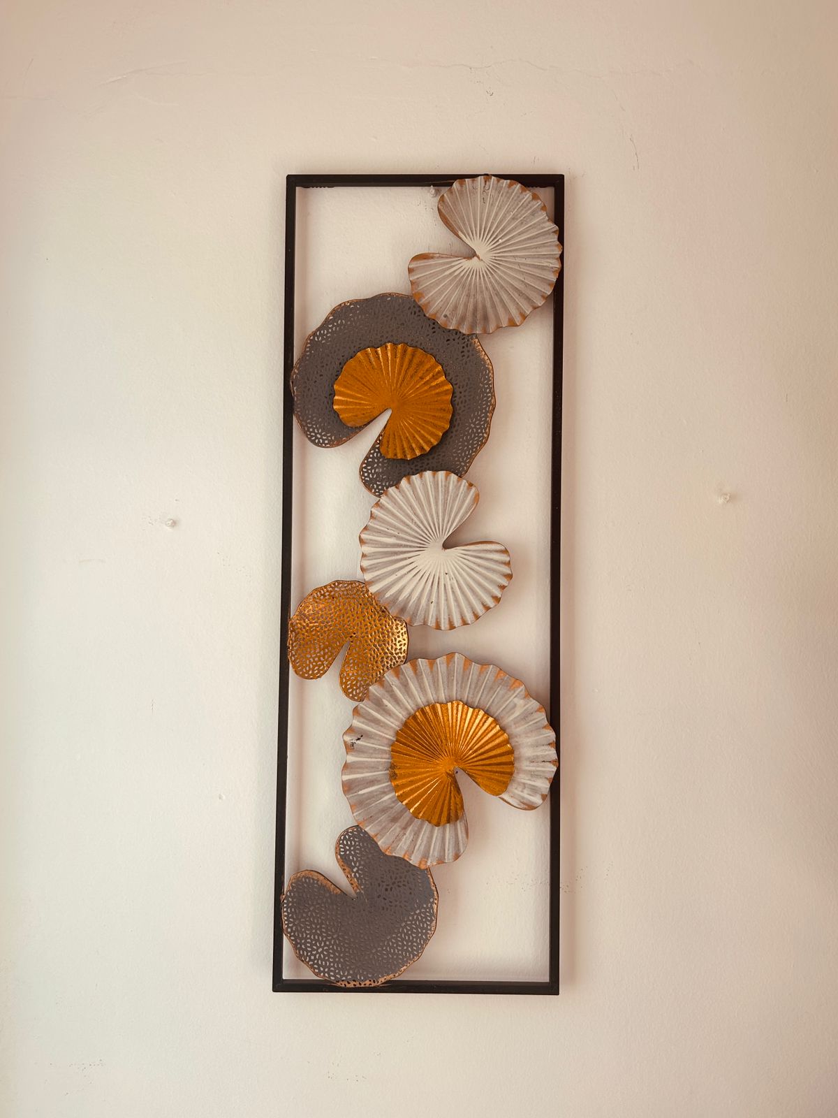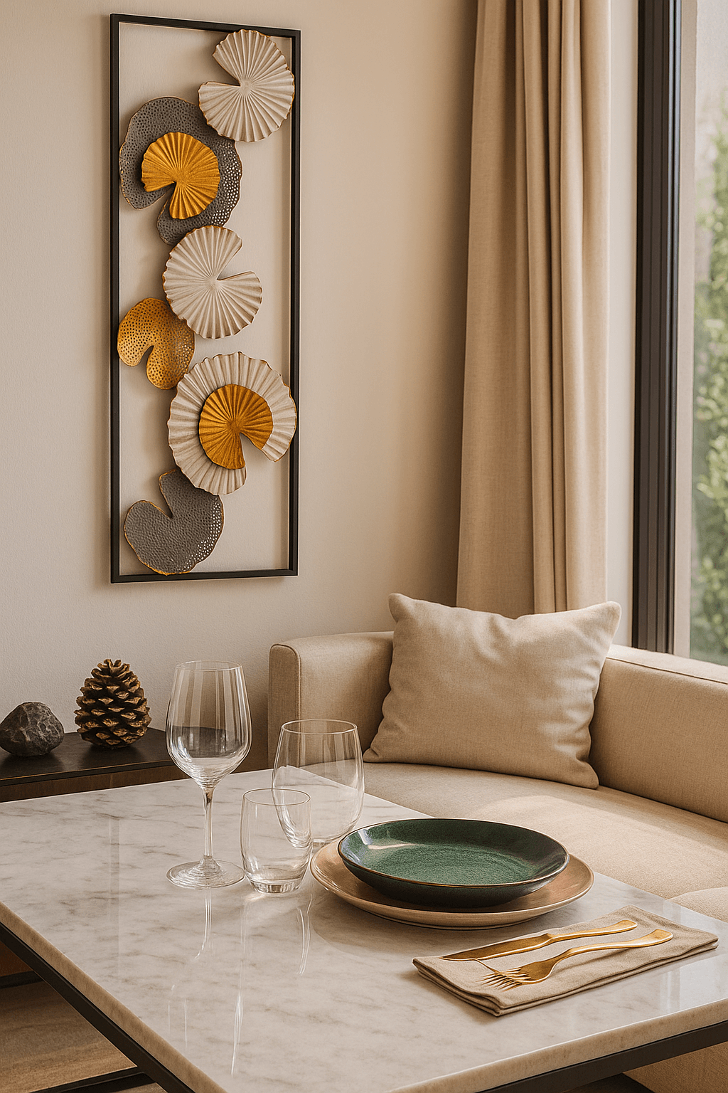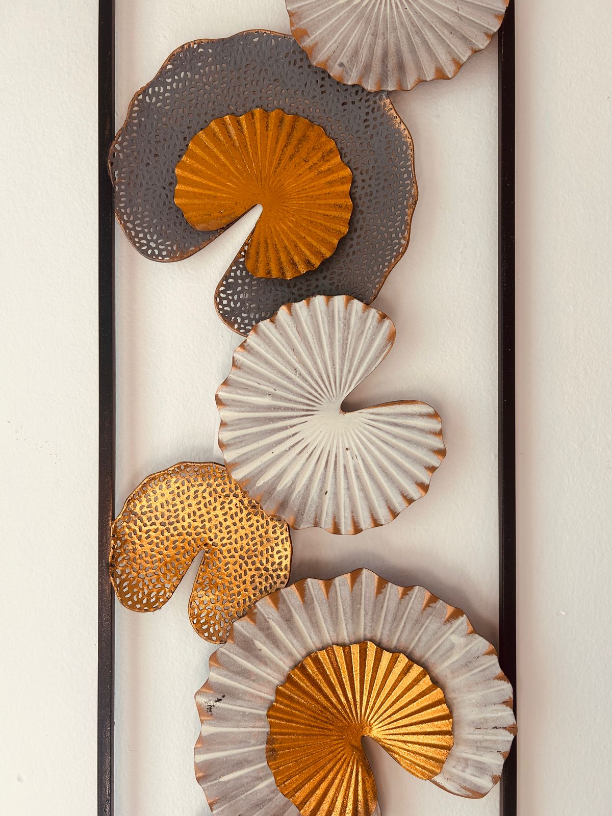 Este friso rectangular fusiona texturas y colores cálidos: dorados vibrantes, grises intensos y detalles en relieve que evocan hojas y formas naturales. Su diseño enmarcado aporta dinamismo y elegancia, perfecta para realzar pasillos, comedores o recibidores.