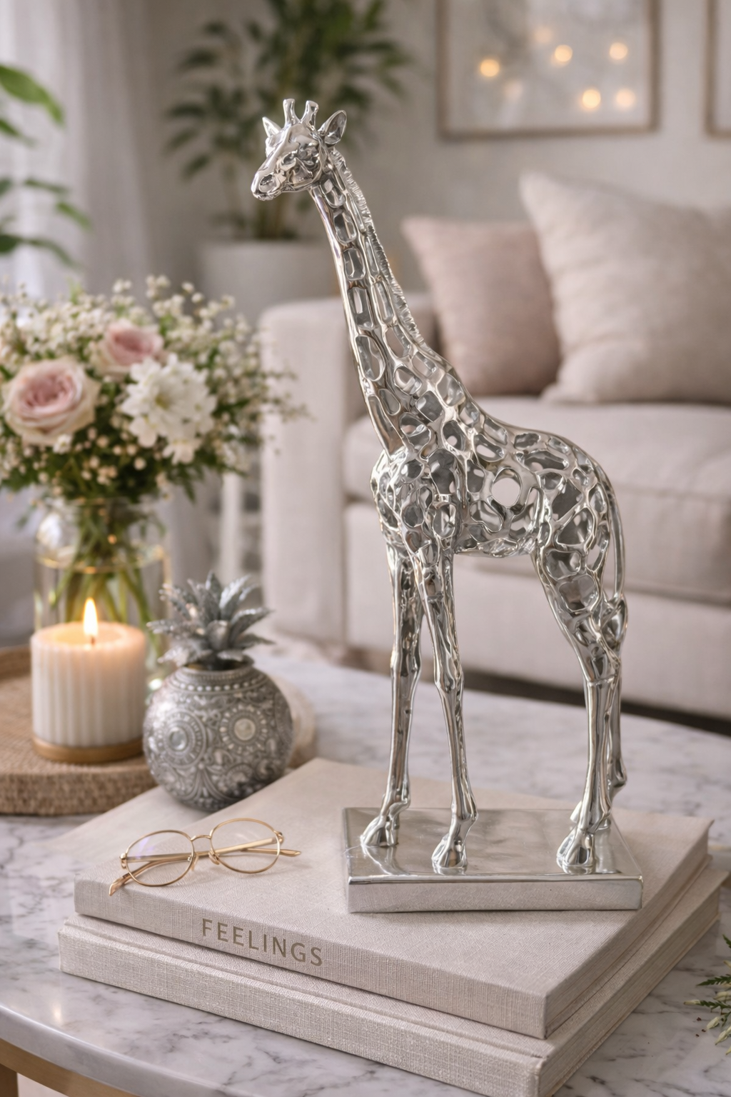 Elegancia con un giro original. Figura de jirafa en acabado plateado brillante, con cuerpo calado que juega con la luz y genera sombras únicas. Una pieza llamativa y moderna para destacar en cualquier ambiente.
