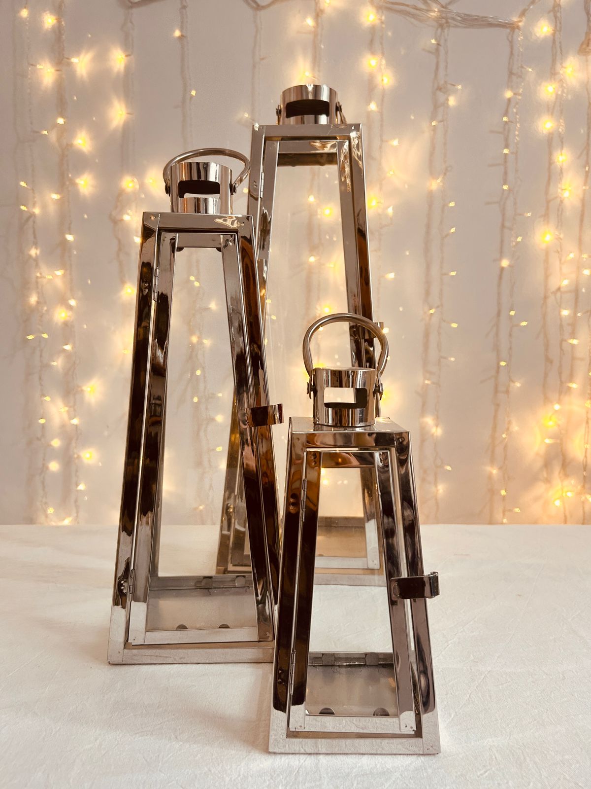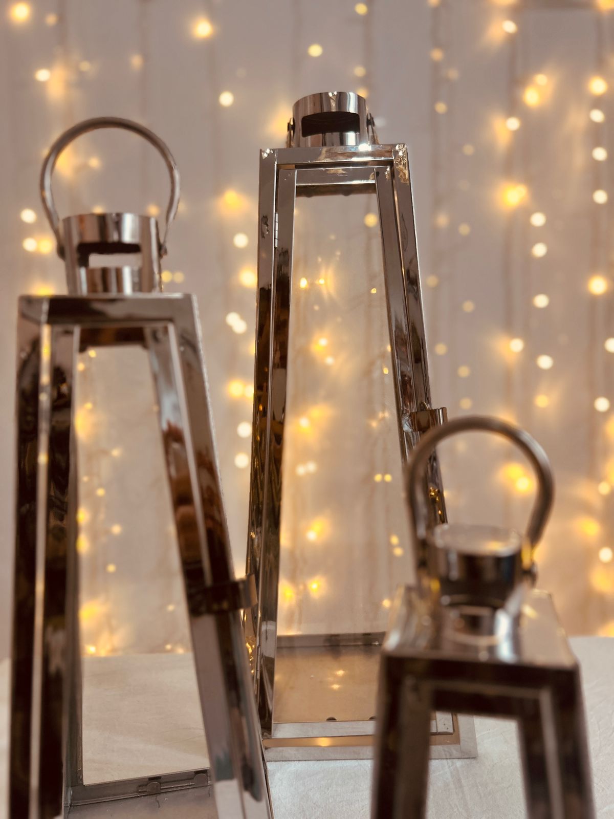 Tres tamaños, un mismo encanto. Faroles tipo fanal en acabado plateado, ideales para sumar brillo y presencia a galerías, halls o rincones destacados.