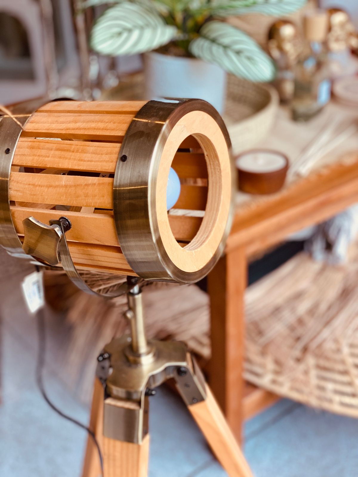 Lámpara cinema. Madera con detalles dorados. Eléctrica. 70 cm de alto aprox.