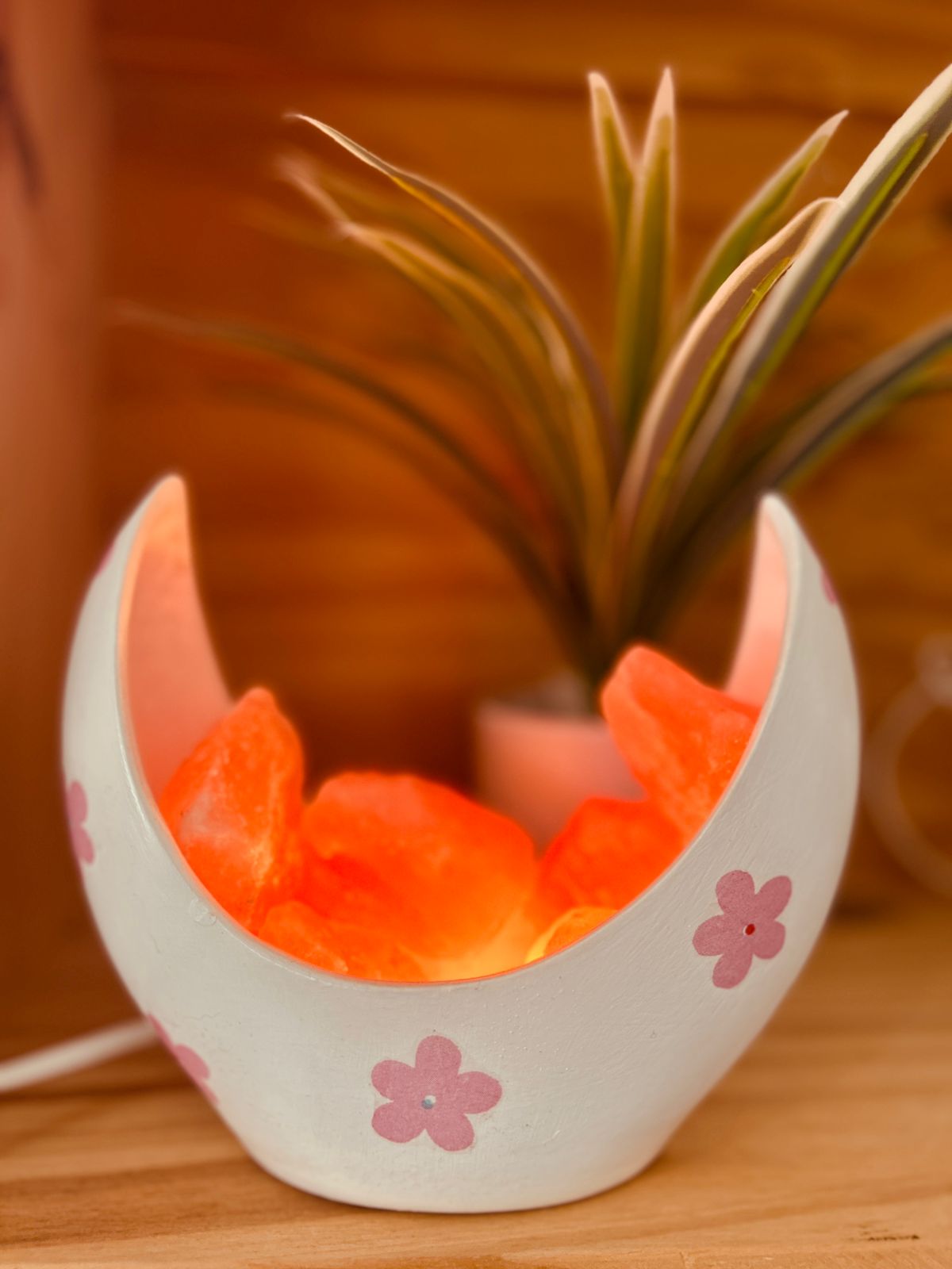 Ideal para dormitorios, espacios de descanso o rincones de meditación. Incluye cuenco de cerámica, sales, foco y cable con interruptor.