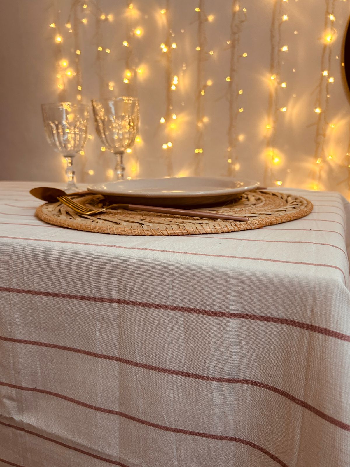 Un toque sutil de color que realza cualquier mesa. Fondo crudo con rayas rosadas que combinan diseño y frescura.