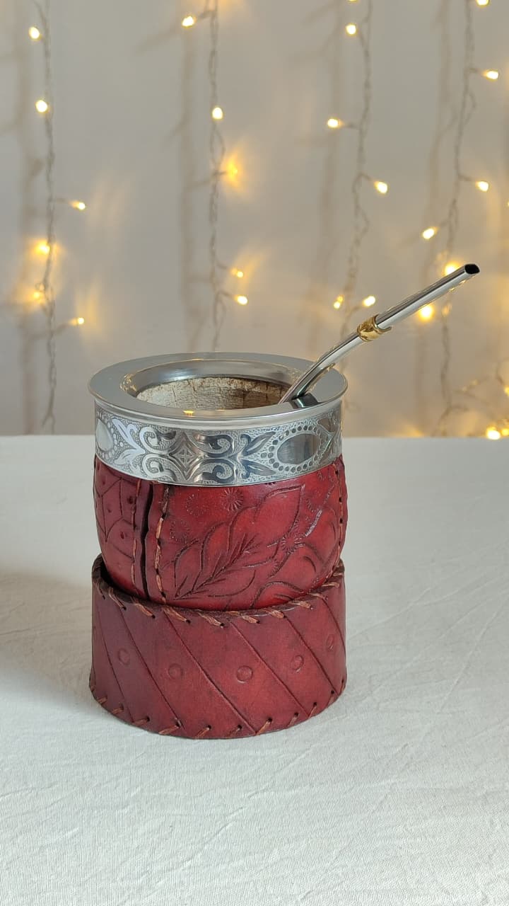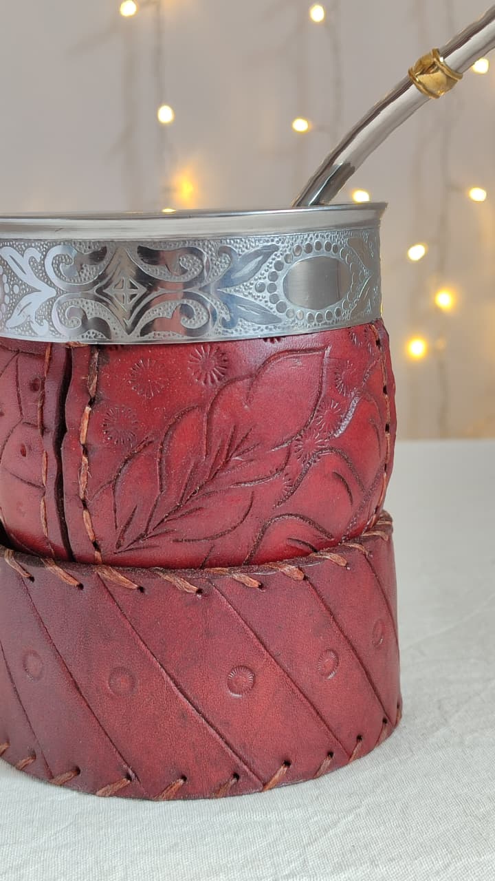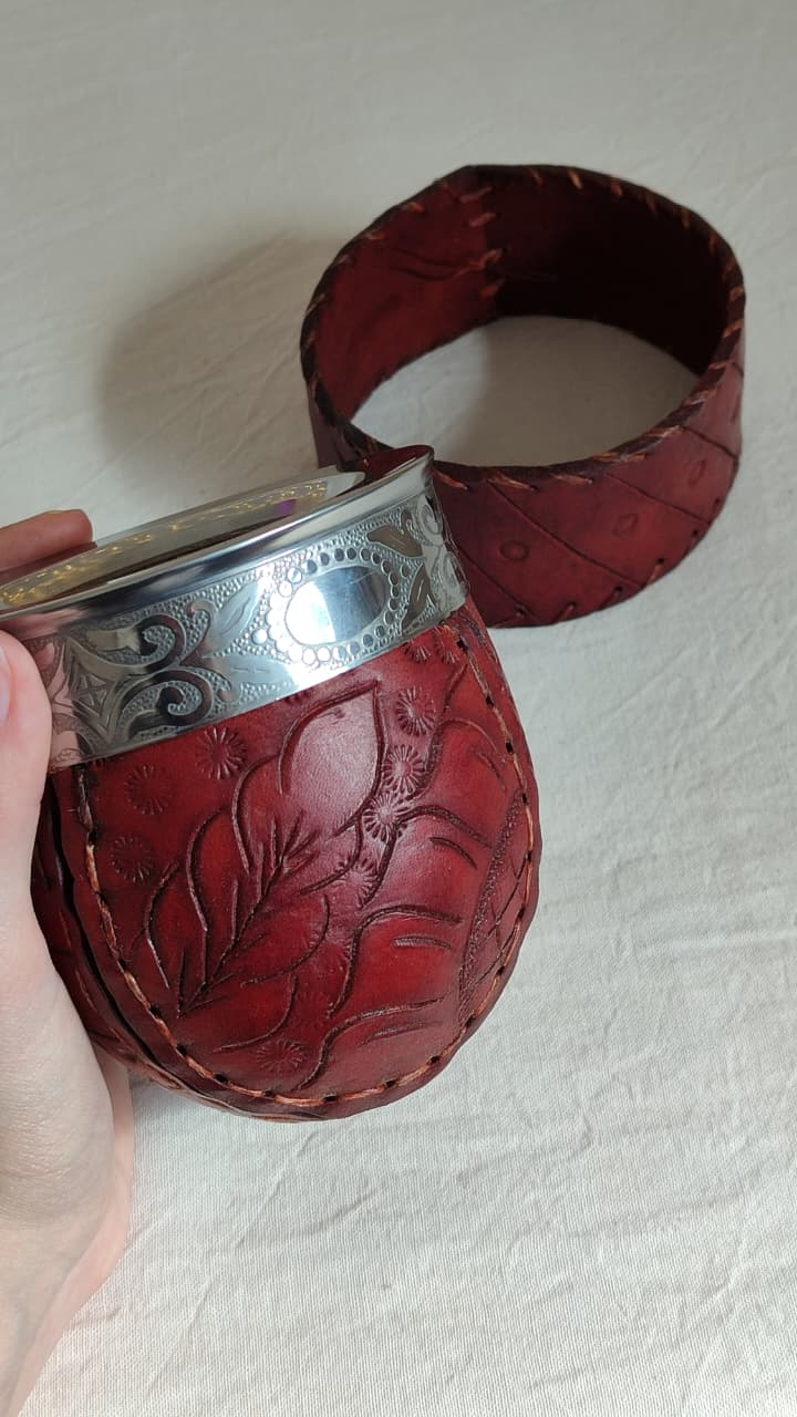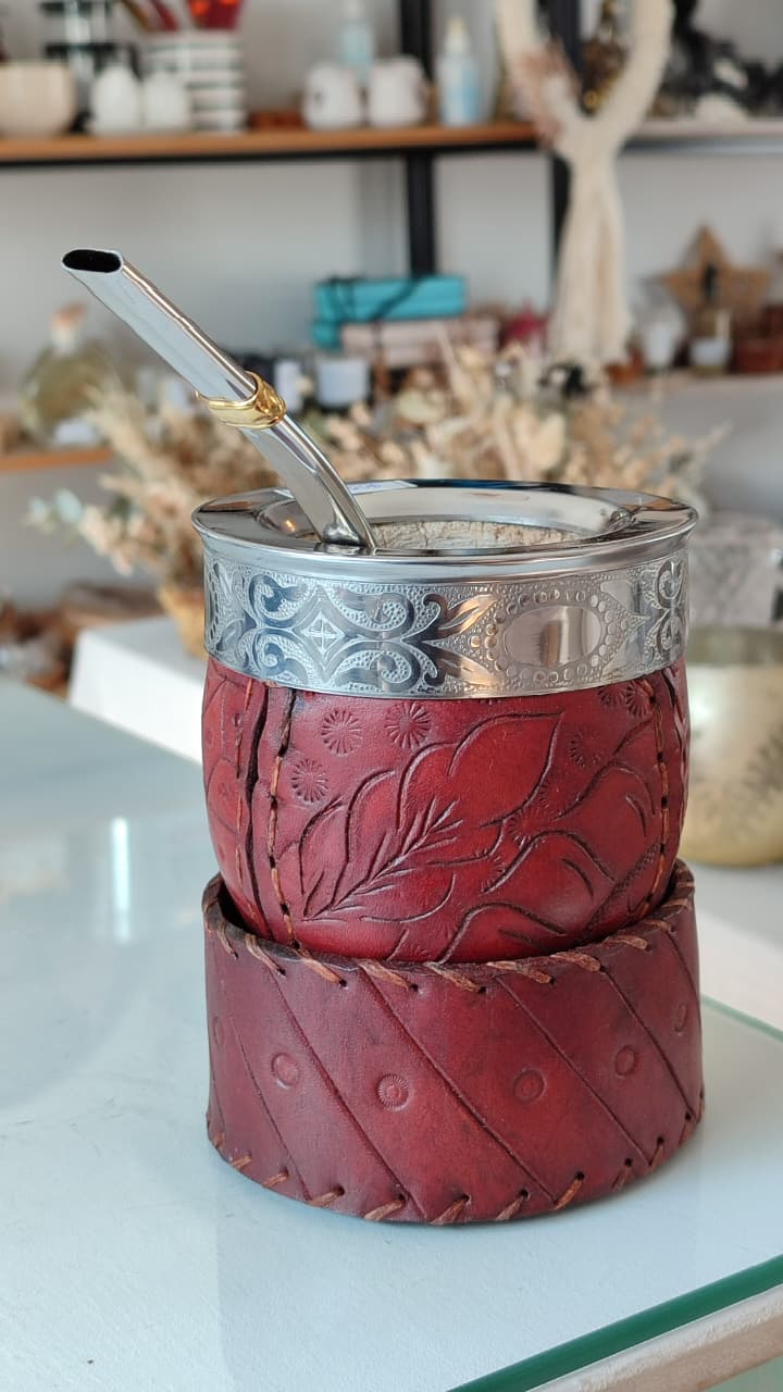 Un mate de colección: en cuero labrado con virola de alpaca también trabajada, un verdadero símbolo de tradición.