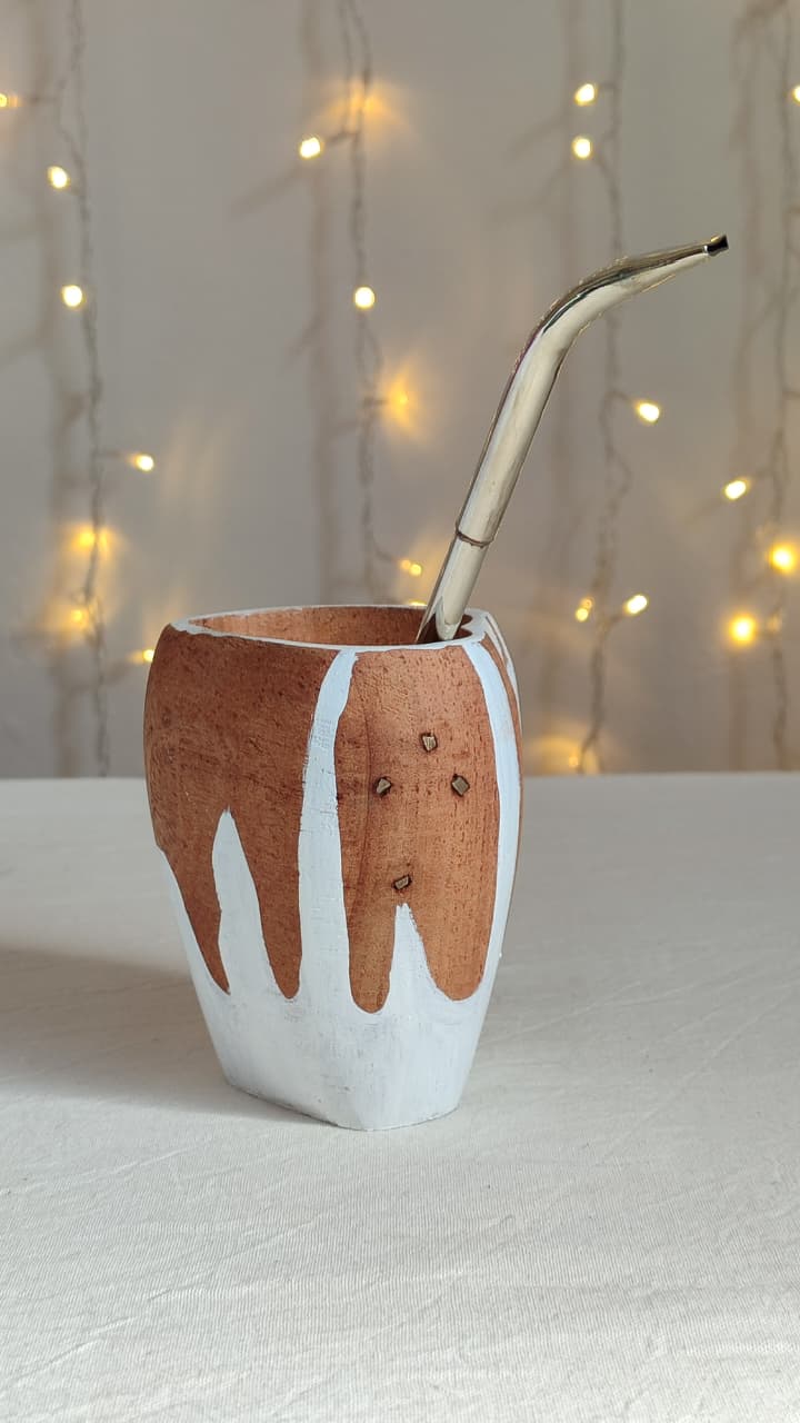 De espíritu artesanal: mate ranchero en madera, decorado con arabescos blancos que le dan un aire auténtico.