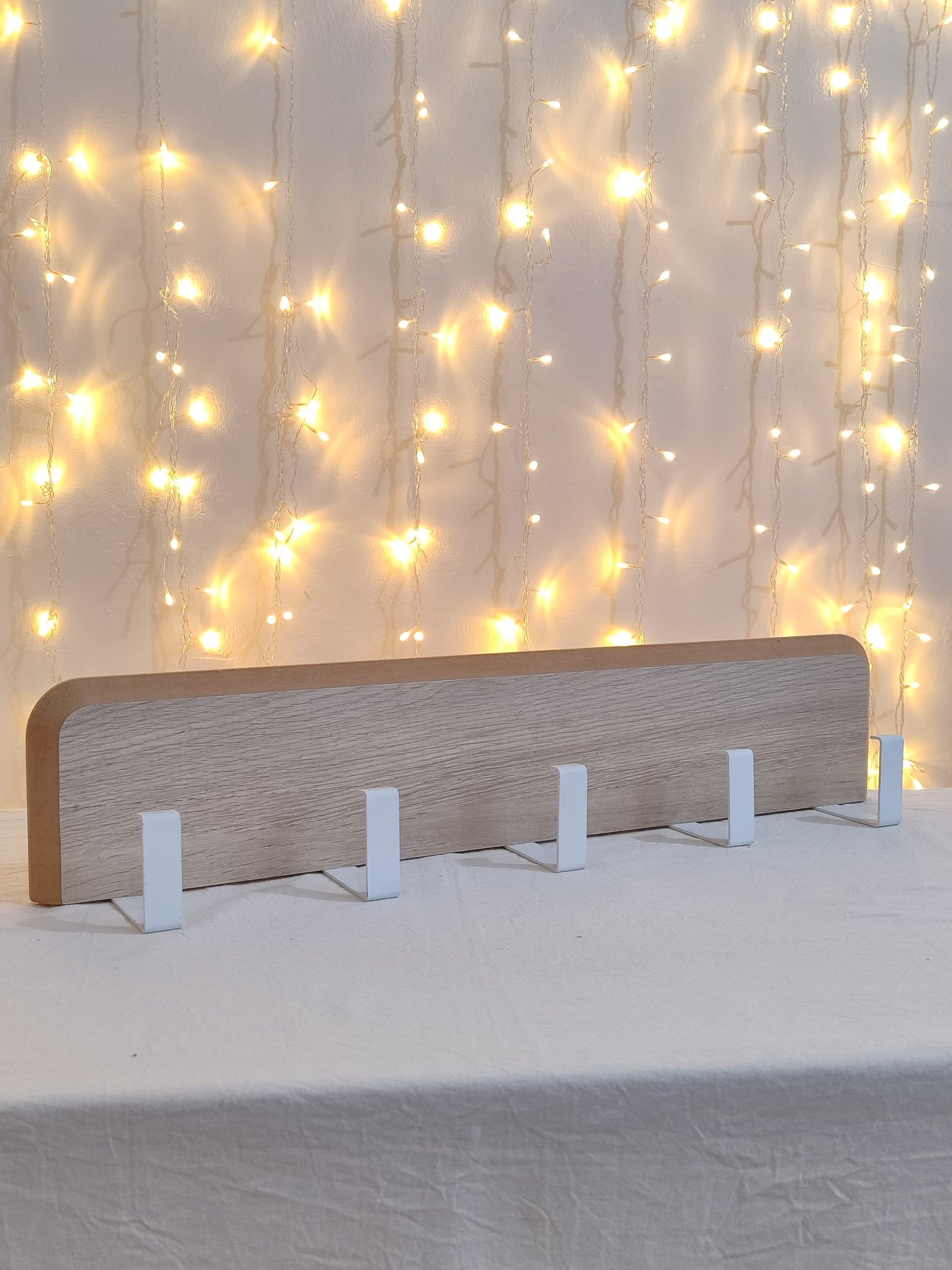Un clásico funcional con estilo. Respaldar de madera y cinco ganchos de metal blancos listos para ordenar tus esenciales del día a día.