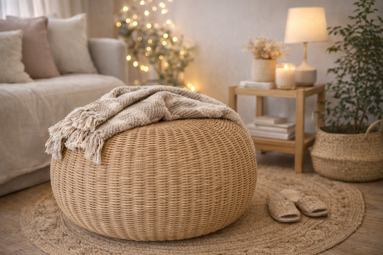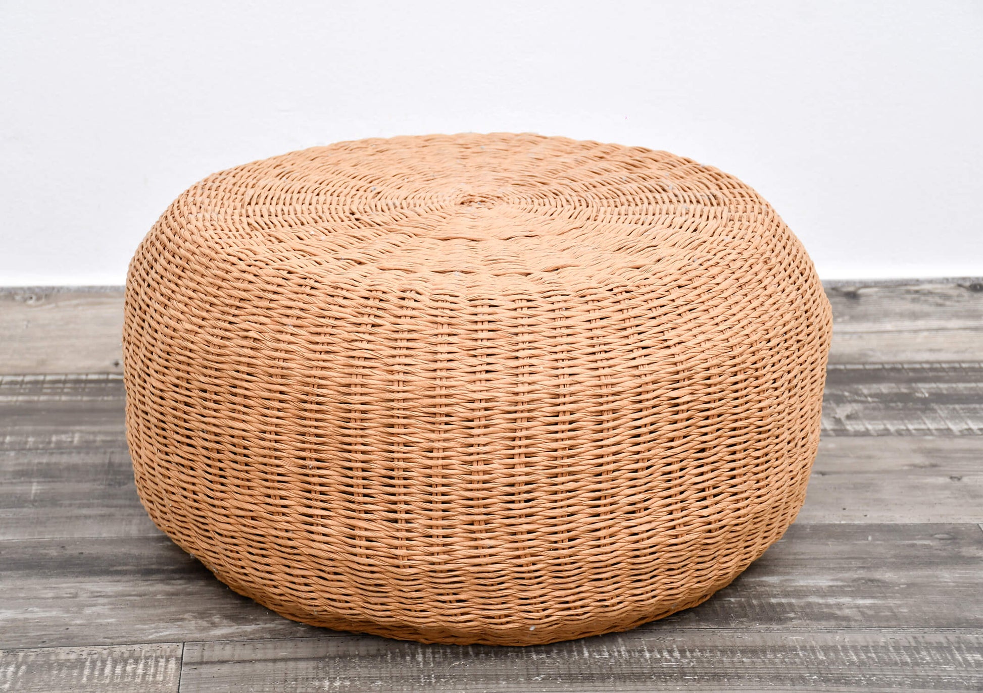 Puff redondo de fibras naturales, firme y decorativo. Ideal como asiento extra o mesa baja. Aporta calidez y textura a cualquier rincón.