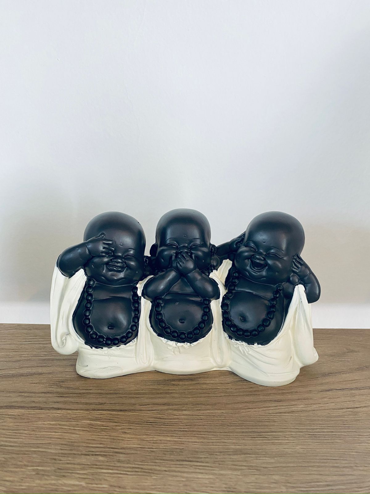 Los budas con los ojos, la boca y los oídos tapados representan la enseñanza japonesa del proverbio "No ver el mal, no escuchar el mal, no hablar el mal" (Mizaru, Kikazaru y Iwazaru). Este principio simboliza la importancia de mantener la mente y el corazón puros, evitando la negatividad y fomentando la paz interior.