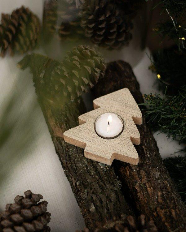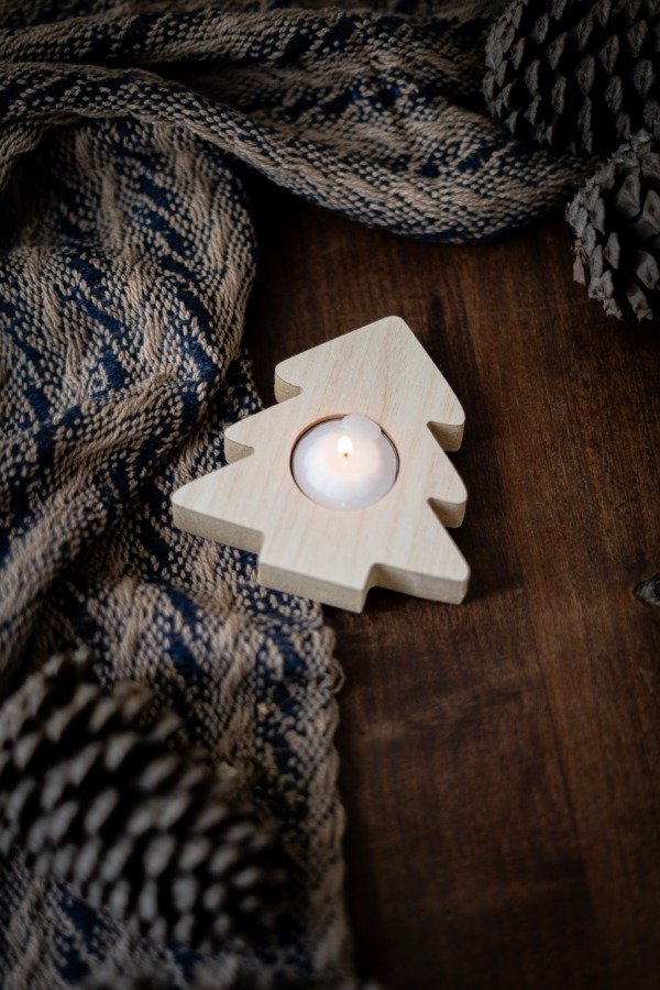 Vela decorativa de madera con forma de arbol.